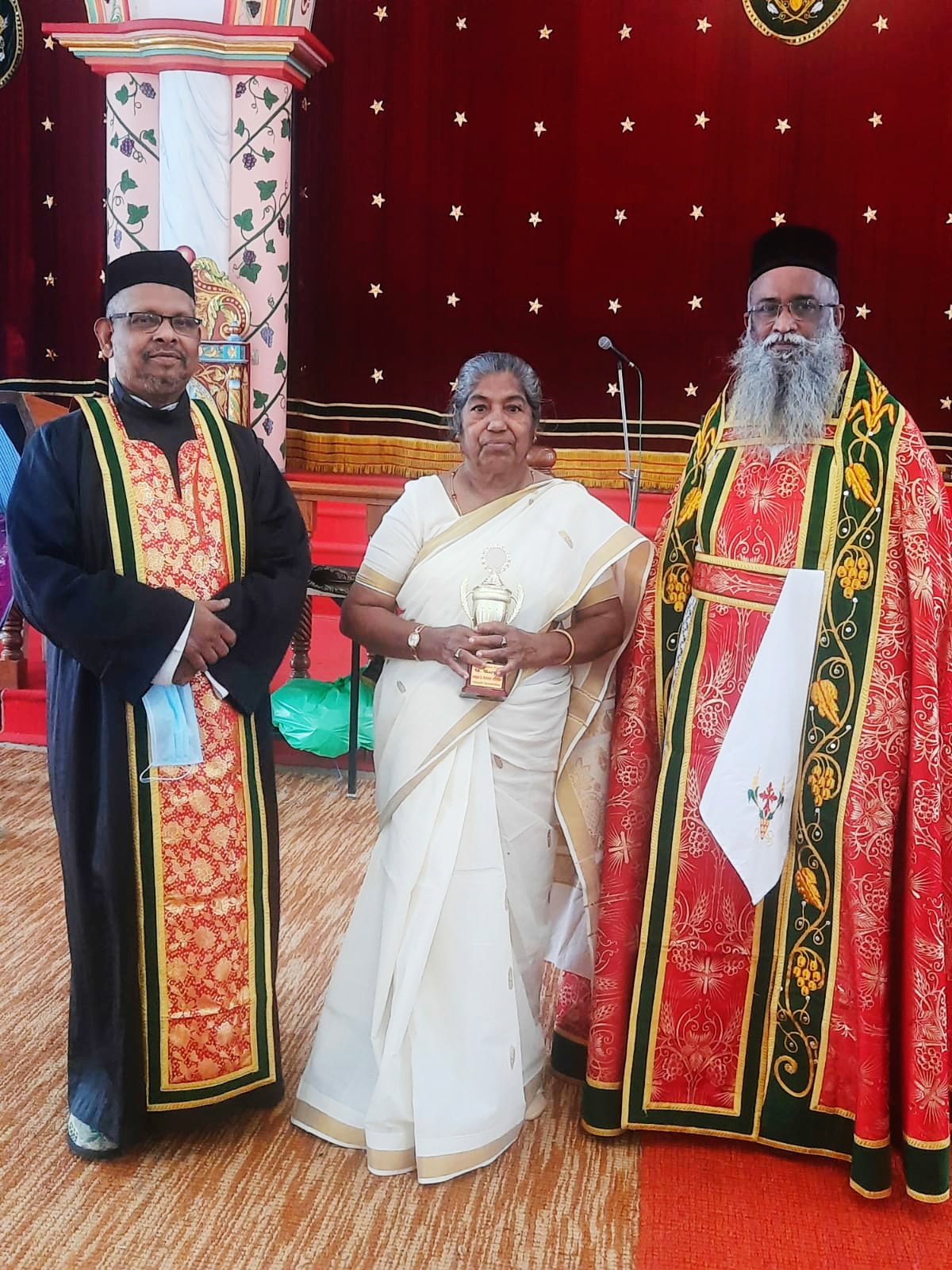 St.Andrews Orthodox Valiyapally, Secunderabad felicitated Mrs.Gracy George for her dedicated work for the church. Rev.Fr. Joshua Abraham, Vicar of St.George Orthodox church, Jeedimetla felicitated her on 20 th March 2022 after the Holy Qurbana along with the Vicar, Rev.Fr. Iype P. Alex. May God bless her with good health to continue her work for our Church.